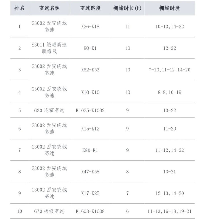 2.绕城高速双向汉城至六村堡之间,外环方向方家村立交至新筑、丈八至雁塔之间,内环方向长安路至丈八、浐河大桥至曲江、方家村立交至纺织城之间通行缓慢。